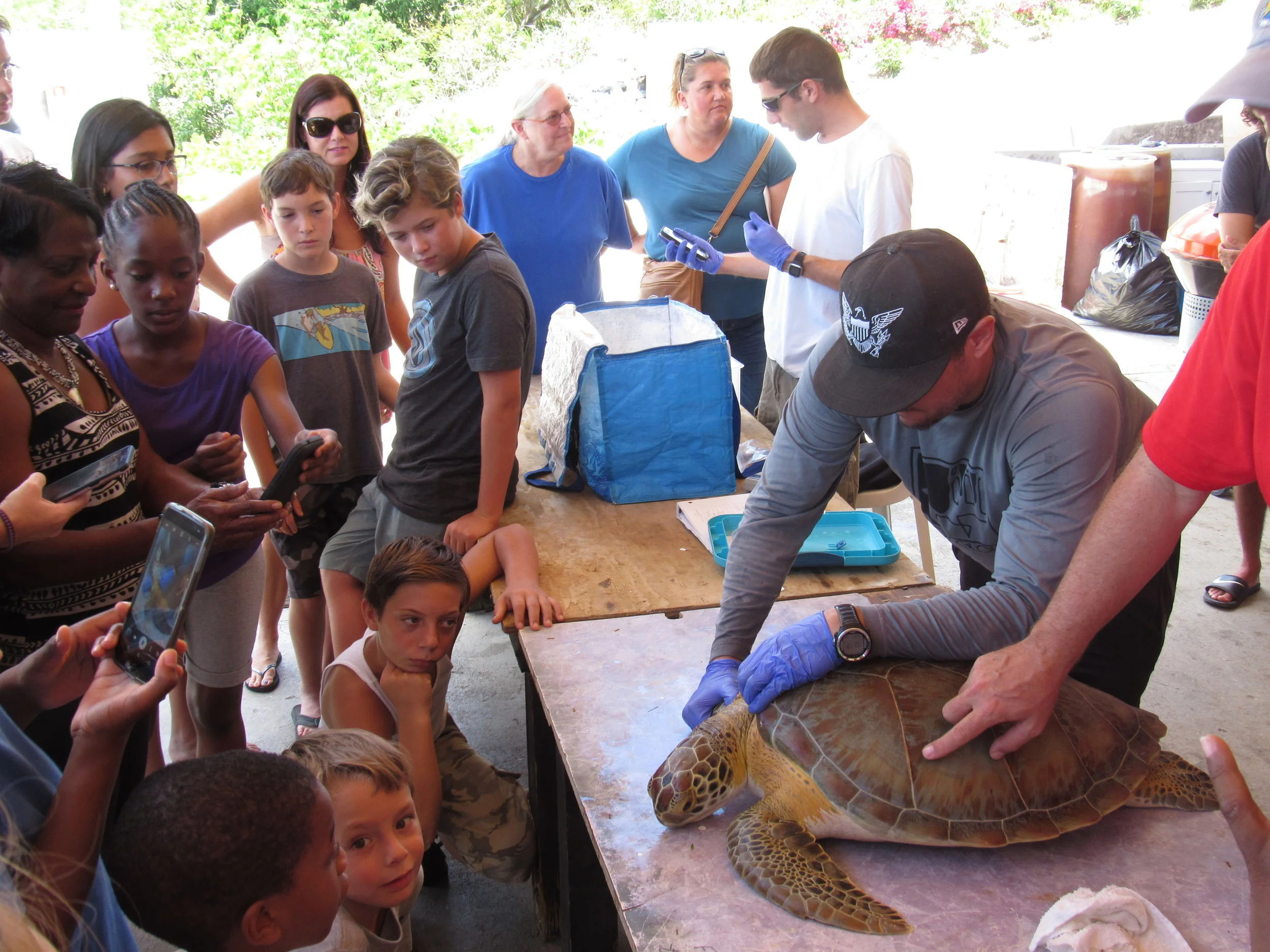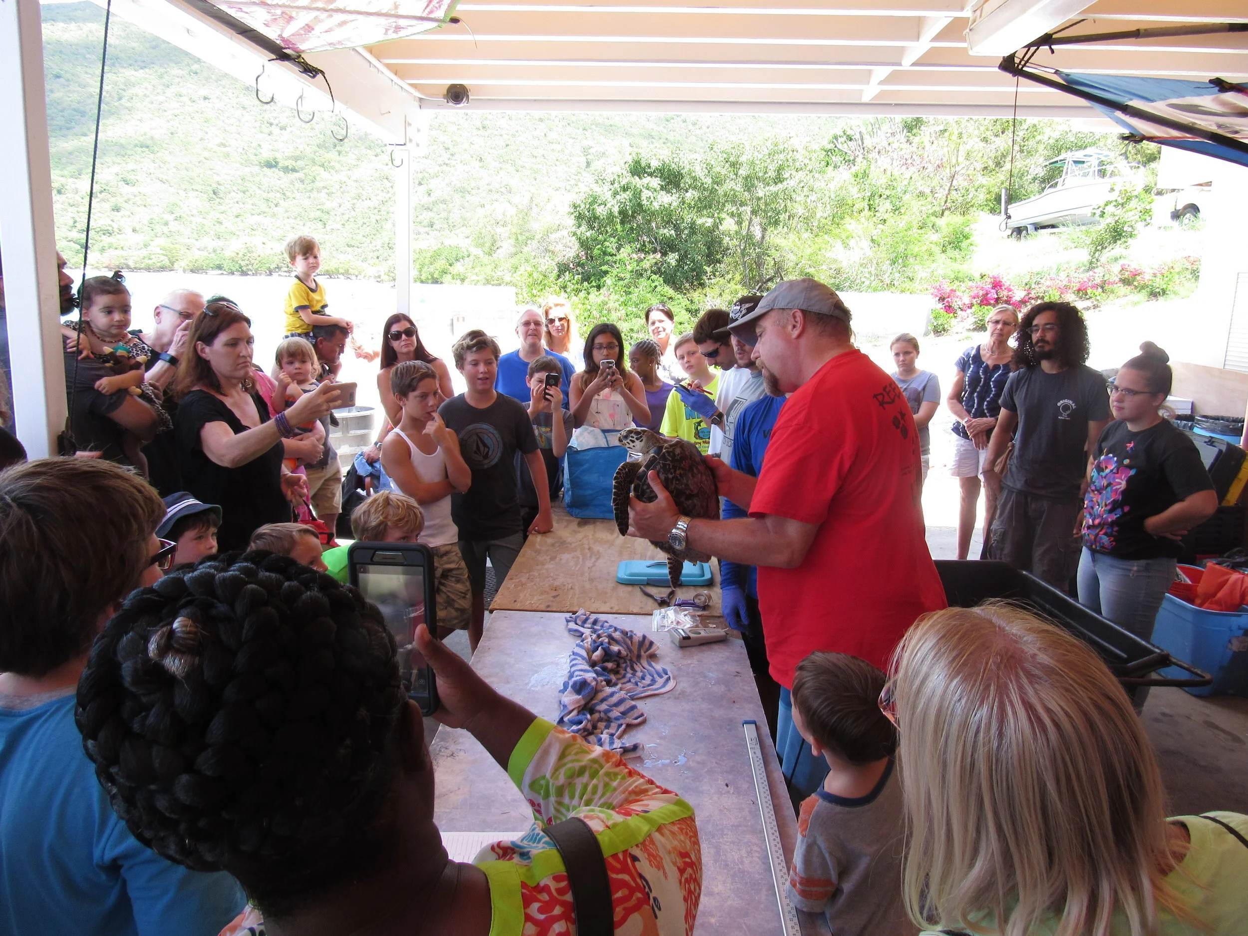 Dr. Jobsis presents a juvenile Hawksbill sea turtle, Eretmochelys imbricata, to a captivated group. All work is conducted pursuant to a National Marine Fisheries Service permit.